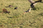 Hyaenas came to join in eating the carcass.Ā We could actually hear the bones crunching as the hyaenas bit into the bones.Ā The jackals did not challenge the hyaenas.