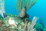 Many cleaner shrimp climbing on and around the eel, eating the dead skin and parasites on the eel,