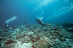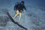 Dive guide Gabriel using his fins to "skimboard" along in the current during a safety stop